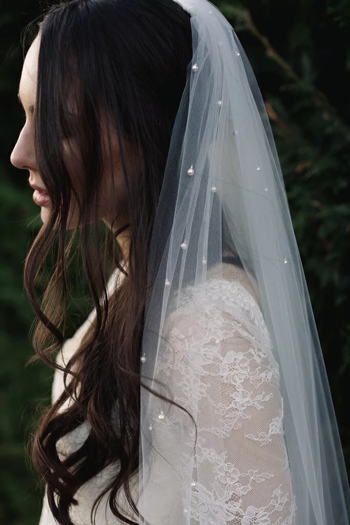 Véu Pérolas Tradicional com aplicação de pérolas sintéticas. Com 2 m ou 3 m de comprimento e largura de 1,40 m. Nobre tule, base em pente com lindo guipure acetinado. Consulte sobre outros comprimentos. Branco ou off white.